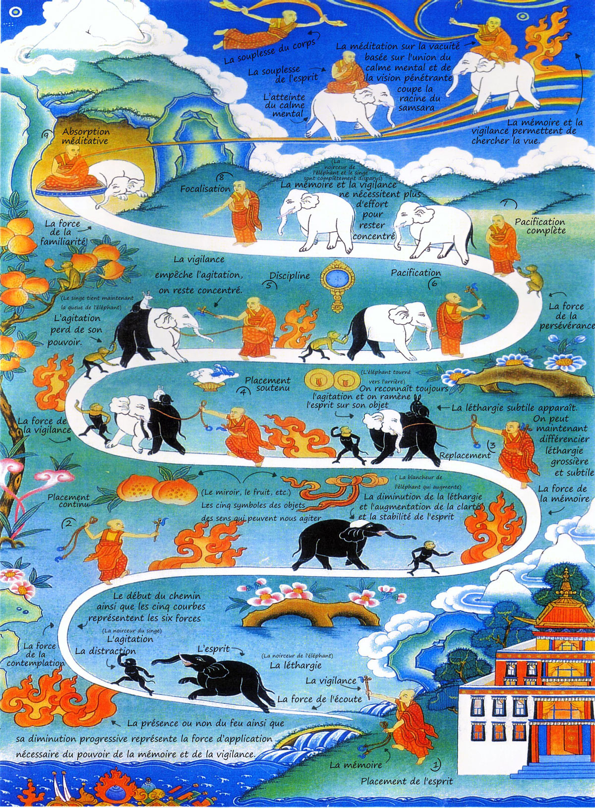 On appelle calme mental l’état d’esprit qui se pacifie en demeurant concentré en un point intérieurement. Après l’avoir obtenu, il est possible de faire naître la vision pénétrante : une sagesse discenrant chacun des phénomènes, conjuguée à la félicité de la souplesse méditative induite par le pouvoir de l’analyse.